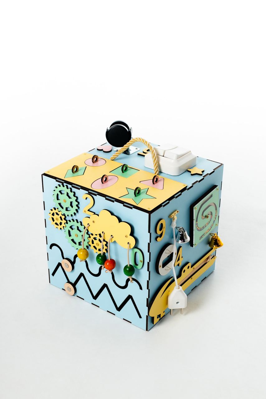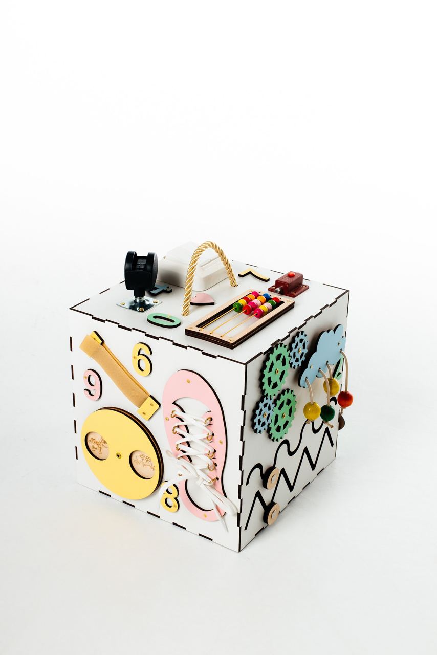 Міцна барвиста іграшка для різнобічного розвитку дітей за методикою Монтессорі. На бізікубикуі знаходяться модулі з життя дорослих. Містить в собі 21 розвиваючих елементів. Стимулює розвиток мозку, який повинен проаналізувати, систематизувати і запам'ятати отриману інформацію. Бізікубик абсолютно безпечний (заклепки неможливо відірвати і з'їсти), і при цьому дуже корисний малюку. Зважаючи на наявність на бізі-комплексі різних елементів, що вимагають узгодженої роботи кистей і пальців рук, а також м'язової, кісткової і нервової систем, це незамінна іграшка для розвитку малюка.